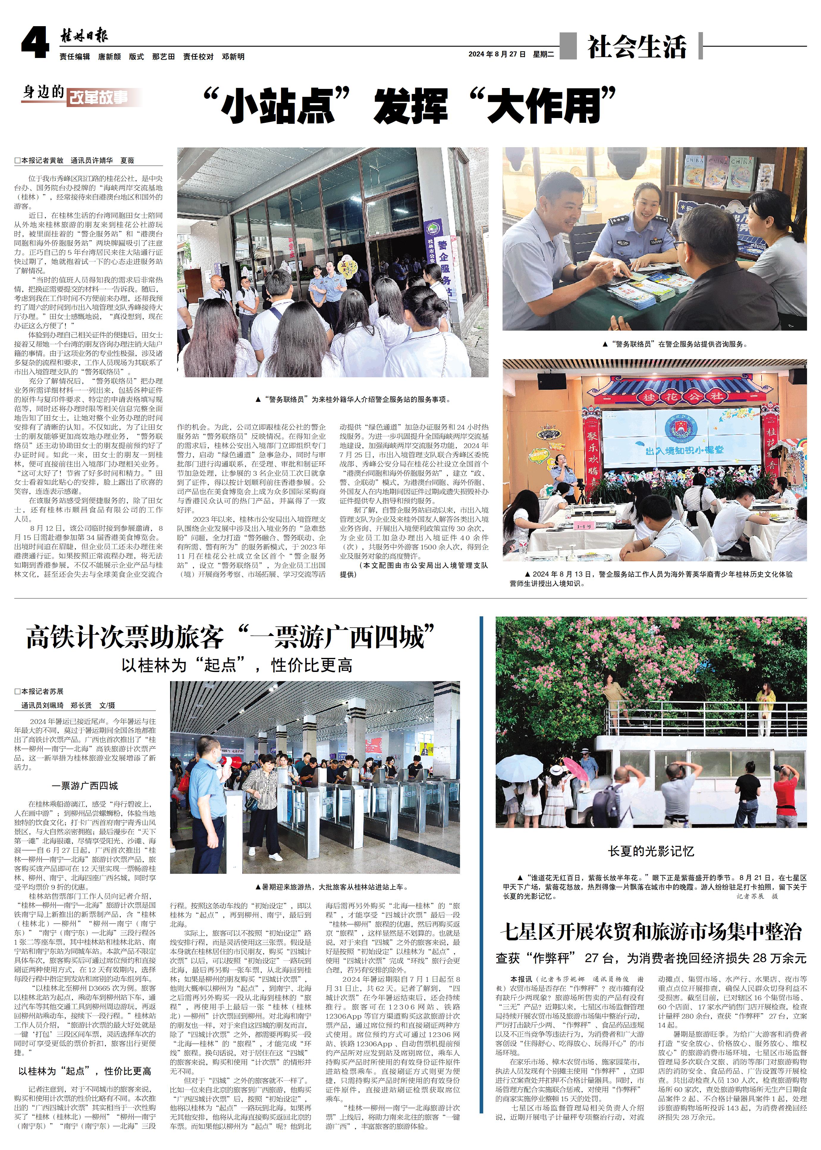 2023年以来,桂林市公安局出入境管理支队围绕企业发展中涉及出入境业务的“急难愁盼”问题,全力打造“警务融合、警务联动、企有所需、警有所为”的服务新模式,于2023年11月在桂花公社成立全区首个“警企服务站”,设立“警务联络员”,为企业员工出国(境)开展商务考察、市场拓展、学习交流等活动提供“绿色通道”加急办证服务和24小时热线服务。为进一步巩固提升全国海峡两岸交流基地建设,加强海峡两岸交流服务功能,2024年7月25日,市出入境管理支队联合秀峰区委统战部、秀峰公安分局在桂花公社设立全国首个“港澳台同胞和海外侨胞服务站”,建立“政、警、企联动”模式,为港澳台同胞、海外侨胞、外国友人在内地期间因证件过期或遗失损毁补办证件提供专人指导和预约服务。