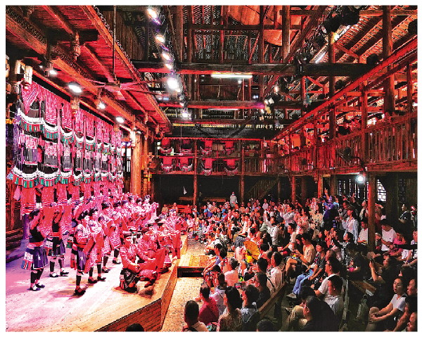 ▲8月25日,黄洛瑶寨歌舞场,中外游客观赏红瑶文化展示。