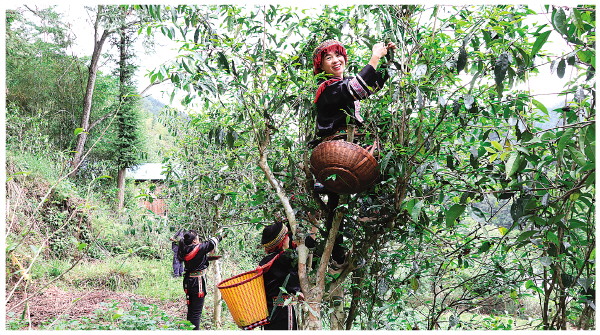 ▲葱坪村村民在采古树茶。 (资源县融媒体中心供图)