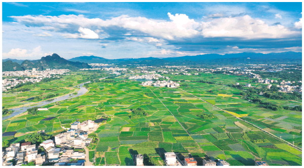 时下正值晚稻、马蹄等农作物生长旺季,桂林乡间田野大片绿油油的禾苗生机盎然。图为8月25日,荔浦市马岭河两岸田园中水稻、马蹄等各种农作物长势良好,形成一幅天然的“油画”。记者何平江 摄
