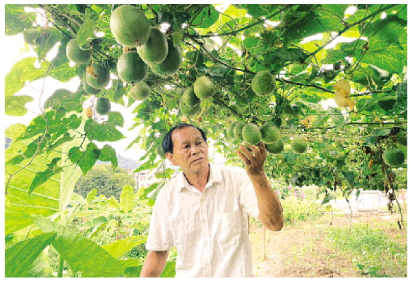 图④:范天环正在果园里查看罗汉果生长情况。 记者蒋璇 摄