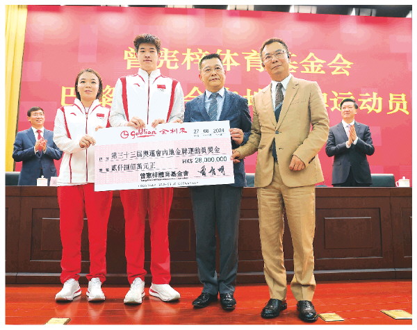 8月27日,曾宪梓体育基金会理事长曾智明(右二)、副理事长曾智雄(右一)向巴黎奥运会内地金牌运动员代表潘展乐(左二)、陈清晨颁奖。