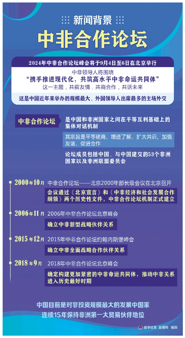 2024年9月4日至6日,新一届中非合作论坛峰会将在北京举行,中非大家庭将迎来又一次团聚。中非人民共同期待,习近平主席同非洲新朋老友一道,引领中非携手推进现代化,共筑高水平中非命运共同体。