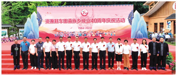 ▲自治区民宗委祝贺团、桂林市代表团、资源县代表团领导与车田苗族乡干部合影。