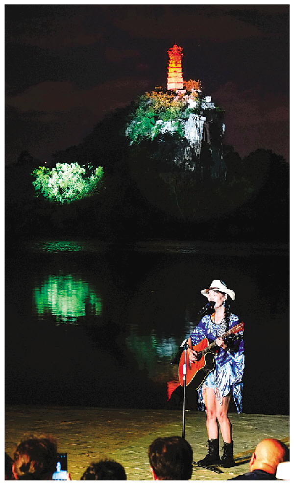 9月16日晚,一群爱好古诗词、喜欢唱歌跳舞的市民相聚在小东江畔、塔山下,共同点亮塔山灯光,一起歌颂明月中秋(多重曝光照片)。 记者何平江 摄
