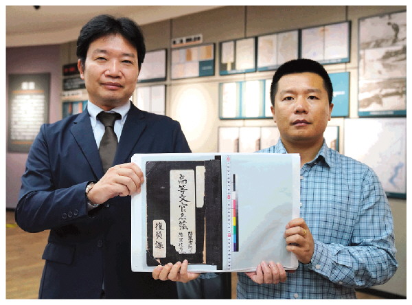 在侵华日军第七三一部队罪证陈列馆新闻中心,日本学者、黑龙江外国语学院特聘教授松野诚也(左)与哈尔滨市侵华日军细菌与毒气战史研究会副秘书长金士成展示《陆军高等文官名簿 陆军书记官 陆军技师》影印件(9月17日摄)。 新华社记者王松 摄