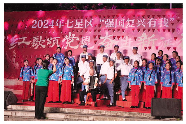此次活动由七星区委宣传部主办,七星街道工委、办事处、人大工委承办。来自七星街道10个社区的代表队轮流登台献唱,以嘹亮的歌声、诚挚的祝愿,庆祝中华人民共和国成立75周年。