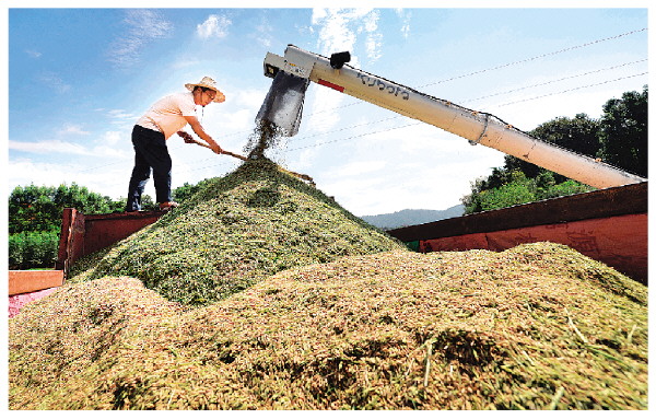 9月27日,恭城瑶族自治县栗木镇上灌村的制种水稻基地,农户正忙着收稻谷。