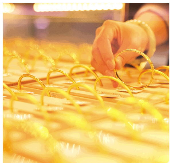 ▲10月23日,浙江省湖州市德清县乾元镇一家金店的营业员在整理黄金首饰。