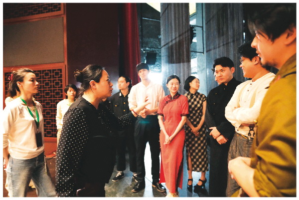 《戏剧春秋》导演李珊在排练现场给演员做指导。