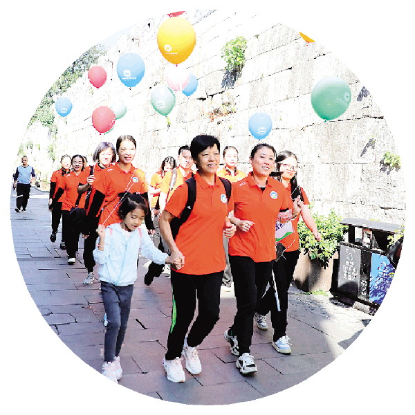 在开幕式后,参加健步走的队员们精神抖擞、步伐矫健,以东西巷正阳门广场为起点,沿着独秀峰·王城景区徒步绕行一圈。健步走活动后,36支代表队还参加了“毽步如飞”“四平八稳”“背篓接绣球”等趣味项目竞赛。活动现场,他们以饱满的热情和高昂的斗志投入比赛,比速度、比耐力、比技巧,既展现了个人良好的精神风貌,又彰显了团队的强大合力。比赛现场呐喊声、加油声、欢笑声不断,将比赛气氛推向一个又一个高潮。