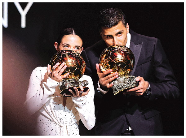 10月28日,男子金球奖获得者罗德里(右)和女子金球奖获得者邦马蒂在颁奖典礼上亲吻奖杯。