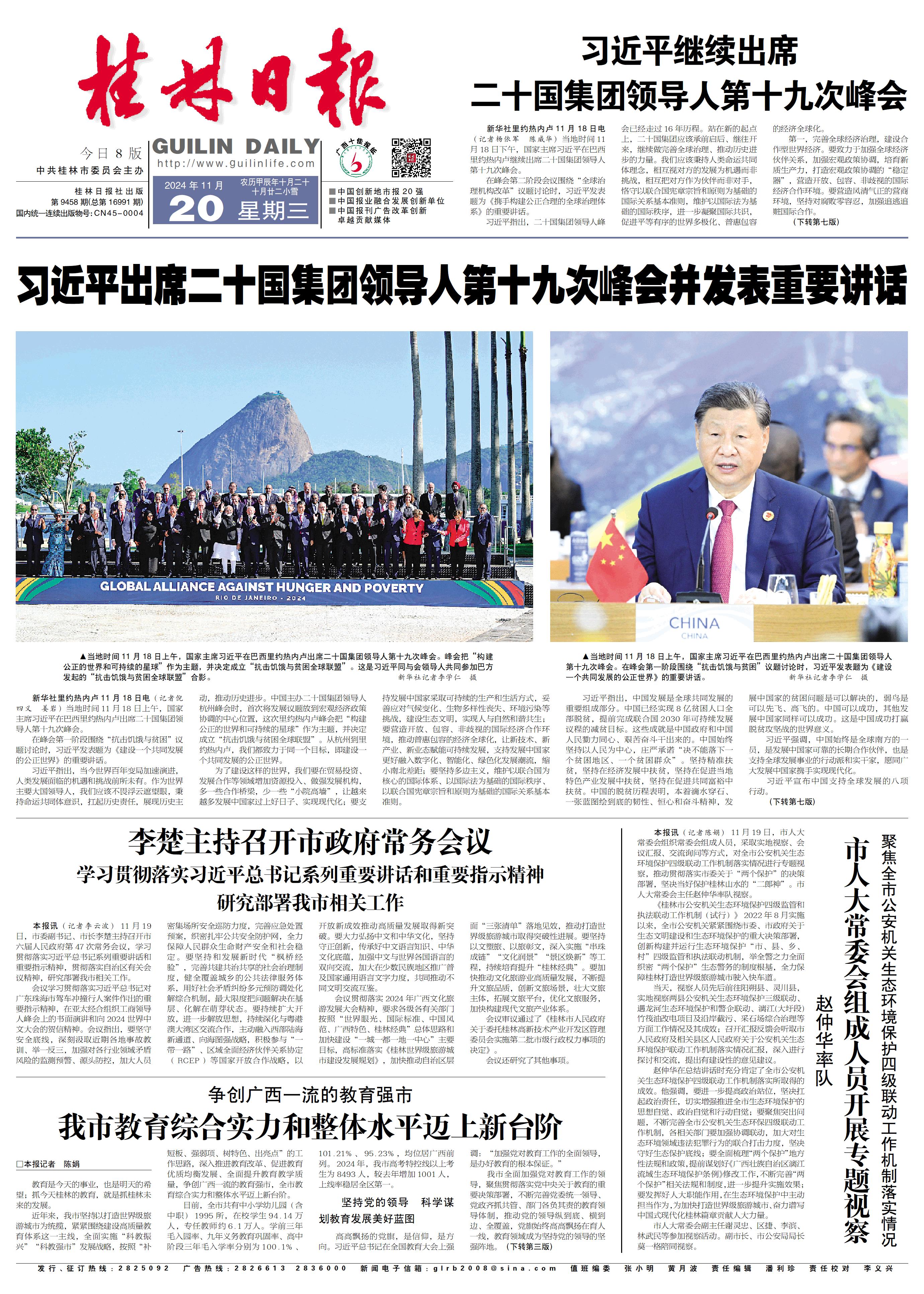 会议学习贯彻落实习近平总书记对广东珠海市驾车冲撞行人案件作出的重要指示精神,在亚太经合组织工商领导人峰会上的书面演讲和向2024世界中文大会的贺信精神。会议指出,要坚守安全底线,深刻汲取近期各地事故教训、举一反三,加强对各行业领域矛盾风险的监测预警、源头防控,加大人员密集场所安全巡防力度,完善应急处置预案,织密扎牢公共安全防护网,全力保障人民群众生命财产安全和社会稳定。要坚持和发展新时代“枫桥经验”,完善共建共治共享的社会治理制度,健全覆盖城乡的公共法律服务体系,用好社会矛盾纠纷多元预防调处化解综合机制,最大限度把问题解决在基层、化解在萌芽状态。要持续扩大开放,进一步解放思想,持续深化与粤港澳大湾区交流合作,主动融入西部陆海新通道、向海图强战略,积极参与“一带一路”、区域全面经济伙伴关系协定(RCEP)等国家开放合作战略,以开放新成效推动高质量发展取得新突破。要大力弘扬中文和中华文化,坚持守正创新,传承好中文语言知识、中华文化底蕴,加强中文与世界各国语言的双向交流,加大在少数民族地区推广普及国家通用语言文字力度,共同推动不同文明交流互鉴。