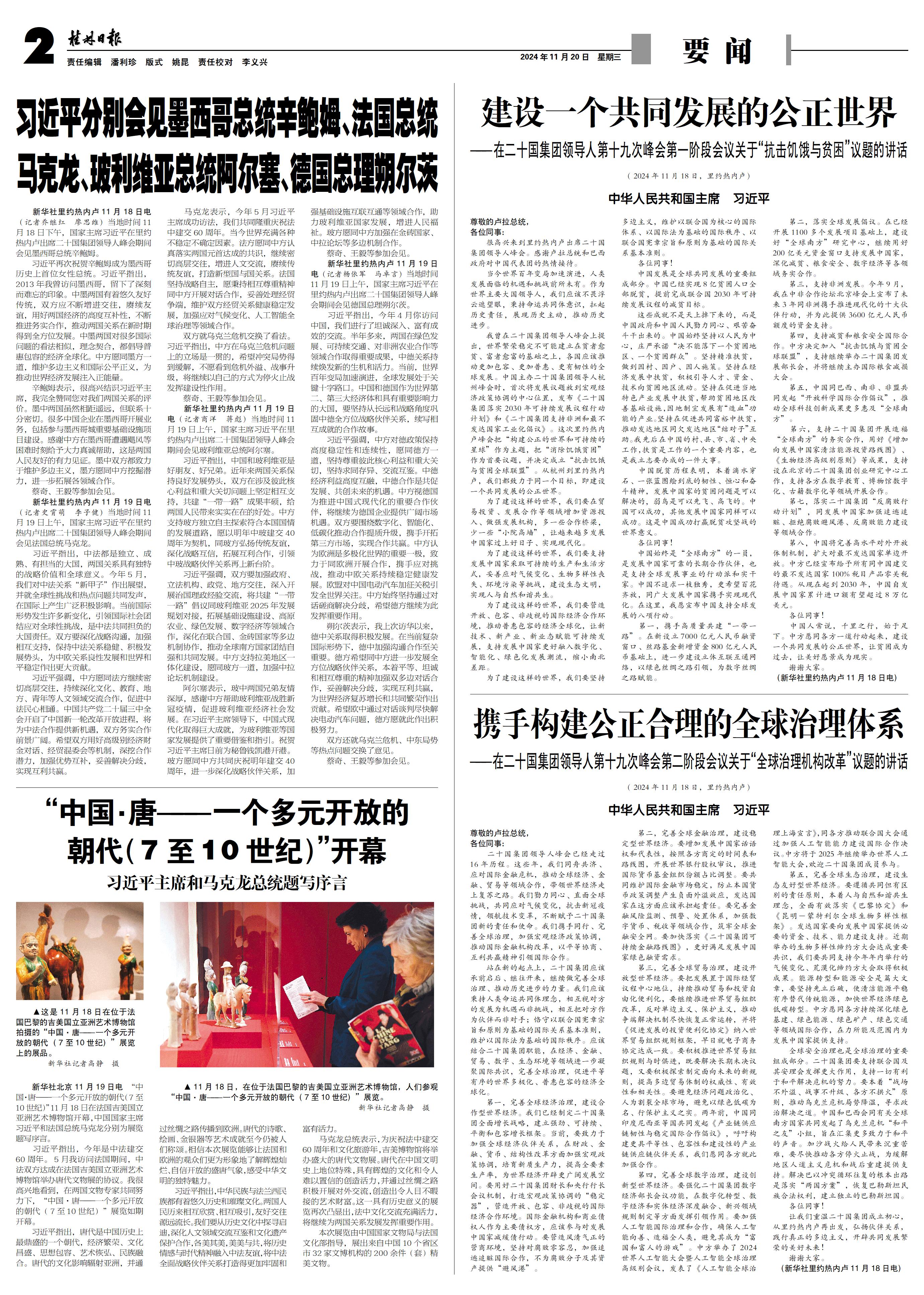 新华社里约热内卢11月18日电(记者乔继红 廖思维)当地时间11月18日下午,国家主席习近平在里约热内卢出席二十国集团领导人峰会期间会见墨西哥总统辛鲍姆。 习近平再次祝贺辛鲍姆成为墨西哥历史上首位女性总统。习近平指出,2013年我曾访问墨西哥,留下了深刻而难忘的印象。中墨两国有着悠久友好传统,双方应不断增进交往,赓续友谊,用好两国经济的高度互补性,不断推进务实合作,推动两国关系在新时期得到全方位发展。中墨两国对很多国际问题的看法相似,理念契合,都倡导普惠包容的经济全球化。中方愿同墨方一道,维护多边主义和国际公平正义,为推动世界经济发展注入正能量。 辛鲍姆表示,很高兴结识习近平主席,我完全赞同您对我们两国关系的评价。墨中两国虽然相距遥远,但联系十分密切。很多中国企业在墨西哥开展业务,包括参与墨西哥城重要基础设施项目建设。感谢中方在墨西哥遭遇飓风等困难时刻给予大力真诚帮助,这是两国人民友好的有力见证。墨中双方都致力于维护多边主义,墨方愿同中方挖掘潜力,进一步拓展各领域合作。 蔡奇、王毅等参加会见。 新华社里约热内卢11月19日电(记者史霄萌 李子健)当地时间11月19日上午,国家主席习近平在里约热内卢出席二十国集团领导人峰会期间会见法国总统马克龙。 习近平指出,中法都是独立、成熟、有担当的大国,两国关系具有独特的战略价值和全球意义。今年5月,我们对中法关系“新甲子”作出展望,并就全球性挑战和热点问题共同发声,在国际上产生广泛积极影响。当前国际形势发生许多新变化,引领国际社会团结应对全球性挑战,是中法共同担负的大国责任。双方要深化战略沟通,加强相互支持,保持中法关系稳健、积极发展势头,为中欧关系良性发展和世界和平稳定作出更大贡献。 习近平强调,中方愿同法方继续密切高层交往,持续深化文化、教育、地方、青年等人文领域交流合作,促进中法民心相通。中国共产党二十届三中全会开启了中国新一轮改革开放进程,将为中法合作提供新机遇,双方务实合作前景广阔。希望双方用好高级别经济财金对话、经贸混委会等机制,深挖合作潜力,加强优势互补,妥善解决分歧,实现互利共赢。 马克龙表示,今年5月习近平主席成功访法,我们共同隆重庆祝法中建交60周年。当今世界充满各种不稳定不确定因素。法方愿同中方认真落实两国元首达成的共识,继续密切高层交往,增进人文交流,赓续传统友谊,打造新型国与国关系。法国坚持战略自主,愿秉持相互尊重精神同中方开展对话合作,妥善处理经贸争端,维护双方经贸关系健康稳定发展,加强应对气候变化、人工智能全球治理等领域合作。 双方就乌克兰危机交换了看法。习近平指出,中方在乌克兰危机问题上的立场是一贯的,希望冲突局势得到缓解,不愿看到危机外溢、战事升级,将继续以自己的方式为停火止战发挥建设性作用。 蔡奇、王毅等参加会见。 新华社里约热内卢11月19日电(记者商洋 蒋彪)当地时间11月19日上午,国家主席习近平在里约热内卢出席二十国集团领导人峰会期间会见玻利维亚总统阿尔塞。 习近平指出,中国和玻利维亚是好朋友、好兄弟。近年来两国关系保持良好发展势头,双方在涉及彼此核心利益和重大关切问题上坚定相互支持,共建“一带一路”成果丰硕,给两国人民带来实实在在的好处。中方支持玻方独立自主探索符合本国国情的发展道路,愿以明年中玻建交40周年为契机,同玻方弘扬传统友谊,深化战略互信,拓展互利合作,引领中玻战略伙伴关系再上新台阶。 习近平强调,双方要加强政府、立法机构、政党、地方交往,深入开展治国理政经验交流,将共建“一带一路”倡议同玻利维亚2025年发展规划对接,拓展基础设施建设、高原农业、绿色发展、数字经济等领域合作,深化在联合国、金砖国家等多边机制协作,推动全球南方国家团结自强和共同发展。中方支持拉美地区一体化建设,愿同玻方一道,加强中拉论坛机制建设。 阿尔塞表示,玻中两国兄弟友情深厚,感谢中方帮助玻利维亚战胜新冠疫情,促进玻利维亚经济社会发展。在习近平主席领导下,中国式现代化取得巨大成就,为玻利维亚等国家发展提供了重要借鉴和指引。祝贺习近平主席日前为秘鲁钱凯港开港。玻方愿同中方共同庆祝明年建交40周年,进一步深化战略伙伴关系,加强基础设施互联互通等领域合作,助力玻利维亚国家发展,增进人民福祉。玻方愿同中方加强在金砖国家、中拉论坛等多边机制合作。 蔡奇、王毅等参加会见。 新华社里约热内卢11月19日电(记者杨依军 马卓言)当地时间11月19日上午,国家主席习近平在里约热内卢出席二十国集团领导人峰会期间会见德国总理朔尔茨。 习近平指出,今年4月你访问中国,我们进行了坦诚深入、富有成效的交流。半年多来,两国在绿色发展、可持续交通、对非洲农业合作等领域合作取得重要成果,中德关系持续焕发新的生机和活力。当前,世界百年变局加速演进,全球发展处于关键十字路口。中国和德国作为世界第二、第三大经济体和具有重要影响力的大国,要坚持从长远和战略角度巩固中德全方位战略伙伴关系,续写相互成就的合作故事。 习近平强调,中方对德政策保持高度稳定性和连续性,愿同德方一道,坚持尊重彼此核心利益和重大关切,坚持求同存异、交流互鉴