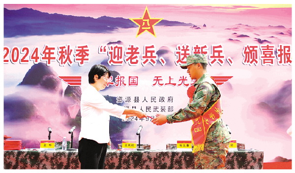 2024年9月14日,资源县委副书记、县人民政府县长王凤玲在“迎老兵、送新兵、颁喜报”大会上为新兵颁发入伍通知书。