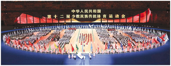 南海之畔,共襄盛会。三亚市体育中心内,56个民族欢聚一堂,共同奏响中华民族一家亲、同心共筑中国梦的华美乐章。20时,开幕式正式开始,各代表团和现场3.5万名观众迎接国旗仪仗队入场,全国少数民族传统体育运动会会旗和第十二届全国少数民族传统体育运动会会旗相继入场,随后全国31个省(自治区、直辖市)、新疆生产建设兵团、香港、澳门代表团和台湾少数民族代表团步入会场。各代表团进行了30秒的驻停表演,呈现了中华民族大家庭各族儿女携手奋进的昂扬风貌。