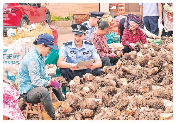 ◥民警与正在分拣荔浦芋的群众聊收成,宣传反诈知识。