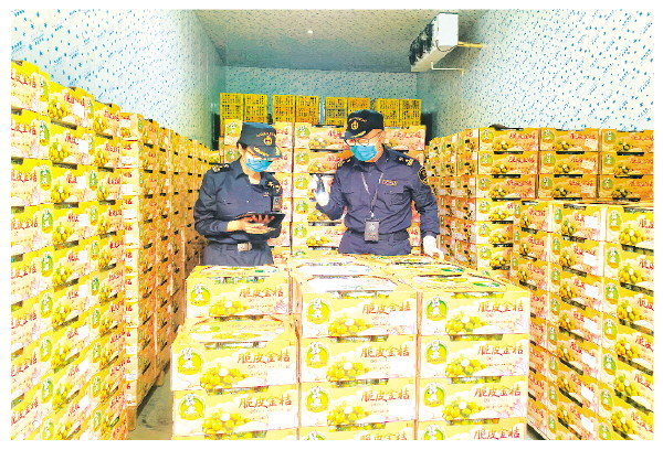 ◥桂林海关关员对企业出口柿饼开展监管工作。