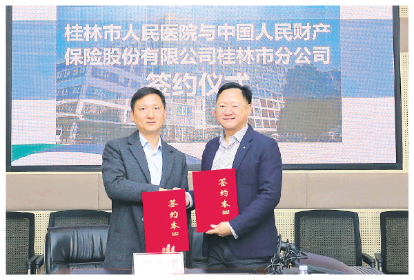 人保财险广西桂林市分公司主要负责人(右)与市人民医院有关负责人签署合作协议。 (人保财险广西桂林市分公司供图)