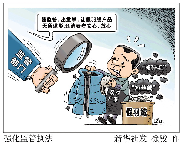 此前,行业协会向公众给出了甄别羽绒制品真假优劣的妙招。但与其教会消费者辨别假货的技能,不如监管部门亮出“牙齿”,在制假售劣源头端就强监管、出重拳,让假羽绒产品无所遁形,还消费者安心、放心。