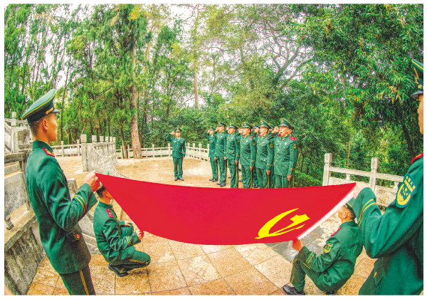 “我志愿加入中国共产党,拥护党的纲领……随时准备为党和人民牺牲一切,永不叛党。”默哀过后,官兵们高举右拳,庄严宣誓。铿锵有力的誓言在青松翠柏间回荡。