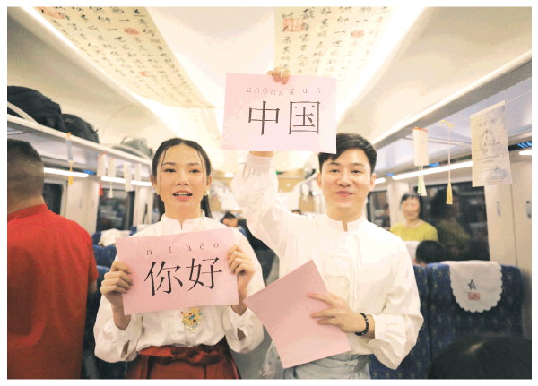 这是4月21日在中老铁路列车上拍摄的“兰亭·雅集”中国书法主题活动现场。当日,由老挝中国文化中心、老中铁路有限公司主办,中老铁路万象运营管理中心承办的“兰亭·雅集”中国书法主题活动走进中老铁路列车,为乘客带来了一场别开生面的文化体验。新华社发(杨永全 摄)