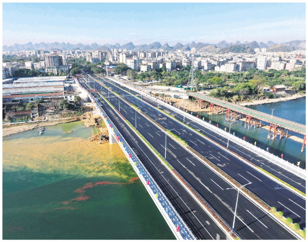 从空中俯瞰,新建成的净瓶山桥如一条长龙横跨漓江两岸,它也是城南跨江通道中特别的存在——作为象山区与七星区之间的道路直连通道,它的重生,在漓江东西两岸修补了“重要一横”,再次将七星区与象山区乃至临桂区串珠成链,进一步提升了市区交通系统运行效率,并承载起市区城南和城东的“交通大道”“经济大道”功能,助力象山、七星两地经济社会更紧密融合发展。