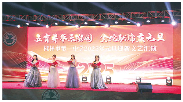 在党的二十届三中全会精神引领下,乘着全国教育大会的东风,2024年12月27日晚,桂林市第一中学的校园内热闹非凡,一片欢声笑语的海洋。全校师生怀揣着一年来的丰硕成果,欢聚一堂,举办主题为“五育并举乐游园,金蛇献瑞庆元旦”2025年元旦迎新文艺汇演。