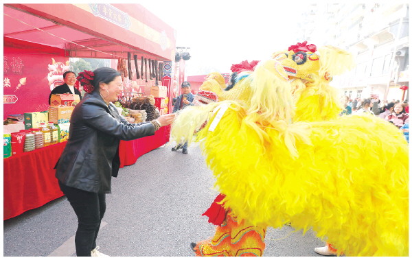 现场的舞狮表演为商户带来好兆头。 记者陈静 摄