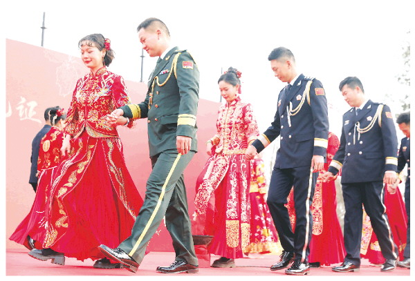 此次集体婚礼以“警此一生,邀您见证”为主题,采用中式婚礼形式,融入了中国经典元素。以中国红为主色调的婚礼现场,营造出喜庆、吉祥、温馨、幸福的氛围。跨火盆、拜天地、撒喜糖、互动小游戏等环节既有中式婚礼的仪式感,也颇有趣味性,引得现场观众笑声掌声不断。