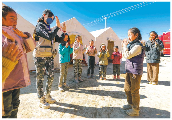 1月11日,在定日县曲洛乡措昂村的受灾群众安置点,谭惜仁(左二)带着孩子们跳舞。
