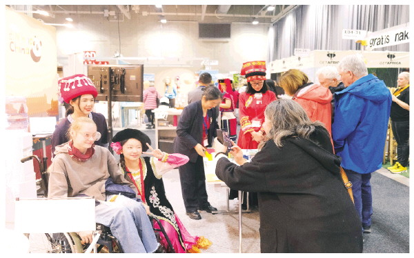 1月10日,在挪威利勒斯特伦举行的挪威旅游展上,参展者与“你好!中国”展台的工作人员合影。新华社记者张玉亮 摄