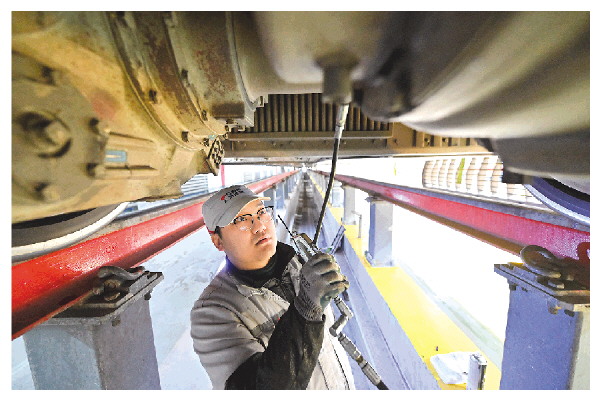 在太原动车组运用所,动车组机械师李珍河在列车底部进行检查维护;为2025年的春运保驾护航。(1月9日摄)。 新华社记者詹彦 摄