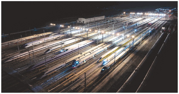 1月13日凌晨,完成检修的动车组列车停靠在贵阳北动车所内(无人机照片)。