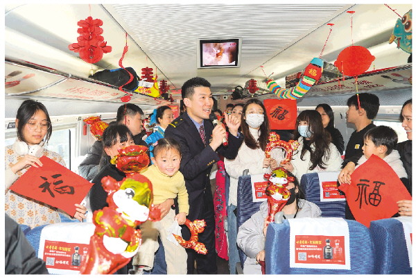 1月13日,在C3685次列车上,旅客与乘务人员互动。
