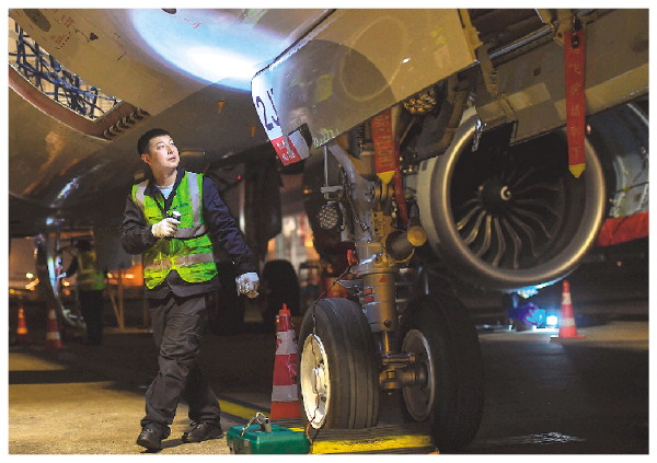 1月12日,在海口美兰国际机场停机坪上,南航工程技术分公司机务工程师对飞机进行深度检查。