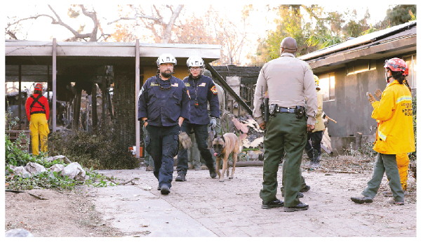 1月12日,救援人员在美国加利福尼亚州洛杉矶县阿尔塔迪纳一栋被摧毁的房屋处搜索失踪人员。新华社发(邱晨 摄)