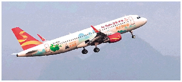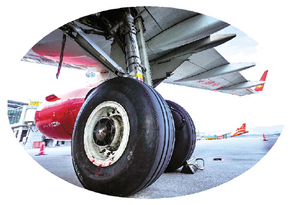 装配着中国首条民用航空子午线轮胎的桂林航空空客A320飞机。 记者何平江 摄