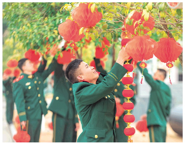 官兵们喜笑颜开挂灯笼,为营区“梳妆打扮”。