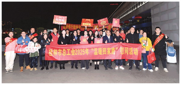 今年,“温暖回家路”活动首次请务工创业人员坐高铁返乡。1月21日晚,桂林站出站口,桂林市总工会、人社局的工作人员以最灿烂的笑容迎接回家的老乡们,为他们送上返乡大礼包。在京创业者、来自兴安的熊孝能说:“我们一路欢歌笑语,唱起了《桂林是我家》。我们在外拼搏,最想念的还是家乡!”