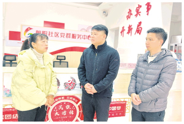 兴安镇党委书记伍平安(左二)走访朝阳社区,了解党建工作和基层社会治理情况。