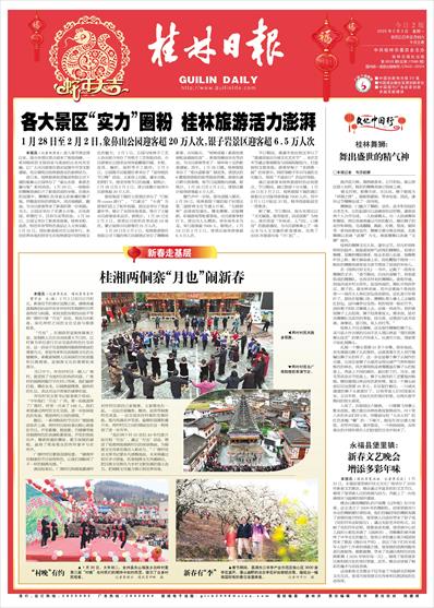 入夜了,在临桂区六塘镇,一只雄狮飞身攀上数米高桩,随之做出各种高难度旋转动作,向十里八乡的乡亲们拜大年。伴随着写有“大吉大利”的红色条幅“唰”的一下展开,烟花在夜空盛大绽放,欢呼声四起,掌声雷动,一个热热闹闹、吉祥喜庆的中国年便在人们盼望的目光中到来了。
