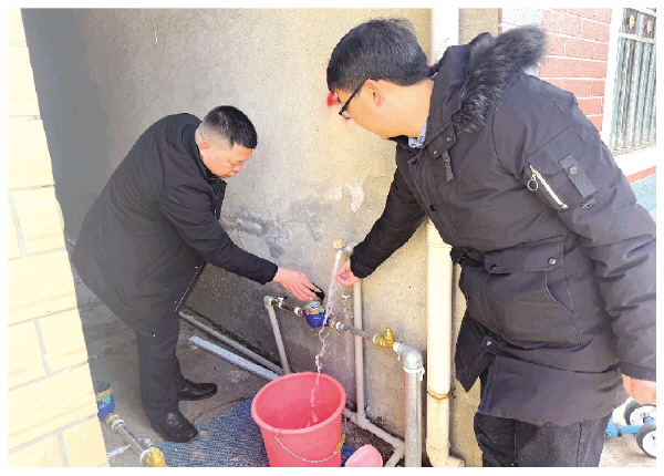 村干部挨家挨户查看自来水接通使用情况。 周璇 摄
