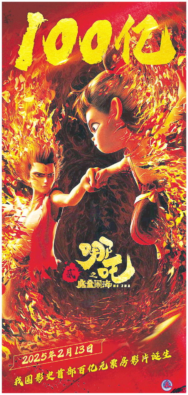 我国影史首部百亿元票房影片2月13日诞生。统计数据显示,截至当日晚间,电影《哪吒之魔童闹海》票房(含预售)达100亿元。 新华社发 陈为 编制