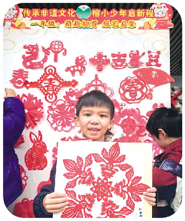 一年级孩子正在展示自己的剪纸作品 (陆芳 摄)