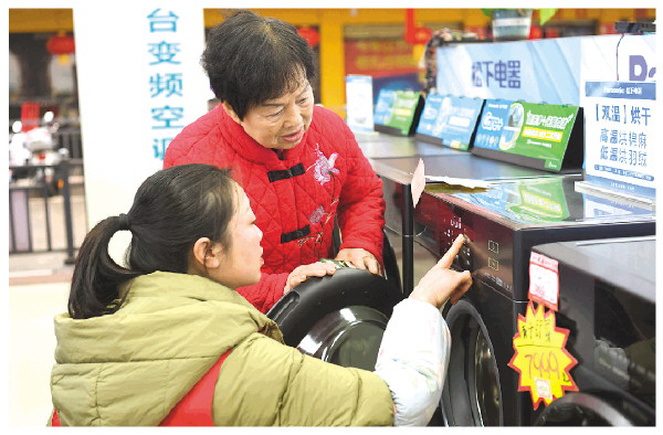 导购员耐心地为消费者讲解产品性能以及“国补”政策。 章艳 摄