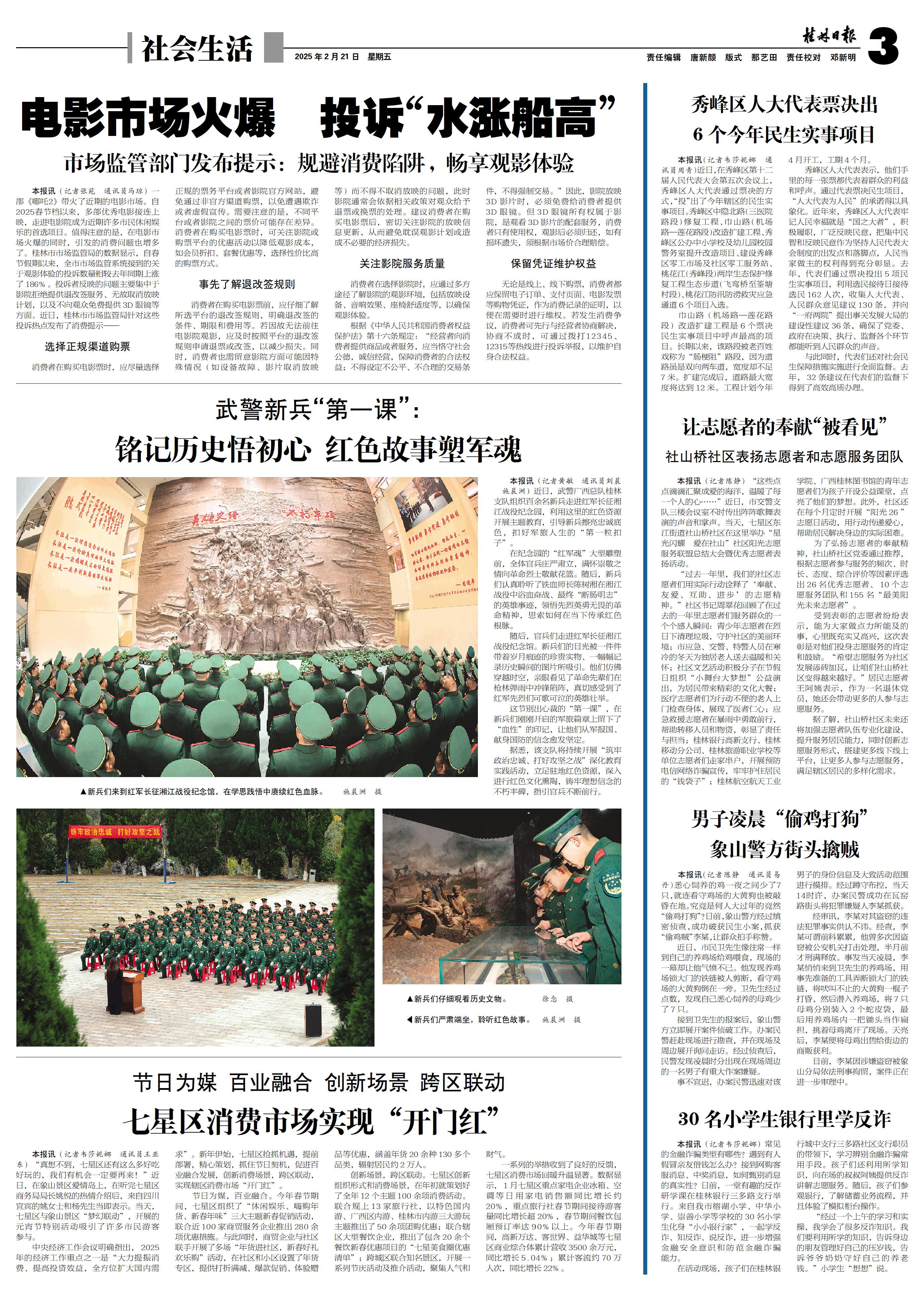 本报讯(记者张苑 通讯员马琼)一部《哪吒2》带火了近期的电影市场。自2025春节档以来,多部优秀电影接连上映,走进电影院成为近期许多市民休闲娱乐的首选项目。值得注意的是,在电影市场火爆的同时,引发的消费问题也增多了。桂林市市场监管局的数据显示,自春节假期以来,全市市场监管系统接到的关于观影体验的投诉数量相较去年同期上涨了186%。投诉者反映的问题主要集中于影院拒绝提供退改签服务、无故取消放映计划,以及不向观众免费提供3D眼镜等方面。近日,桂林市市场监管局针对这些投诉热点发布了消费提示——