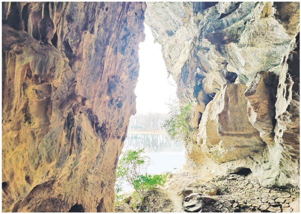 图①:透过岩洞看洞外的漓江风光。