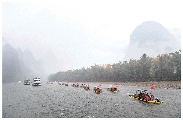 1月31日,一艘艘游船满载游客,在烟雨漓江中穿梭,勾勒出一幅美丽的山水画卷。(资料图片)