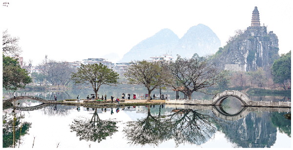 连日阴雨绵绵,漓江水量有所增加,小东江水位随之上涨。在穿山公园塔山前江心岛上的几棵榕树和拱桥与水面倒影相连,彰显出独特的中式山水美学。记者何平江 摄